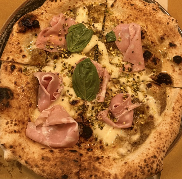 La Mortazza Glamour è dichiarazione d’intenti: fiordilatte, mortadella IGP e pistacchio si muovono in equilibrio tra golosità e misura, senza mai cadere nell’eccesso. È una pizza che gioca con il piacere, ma lo fa con controllo.